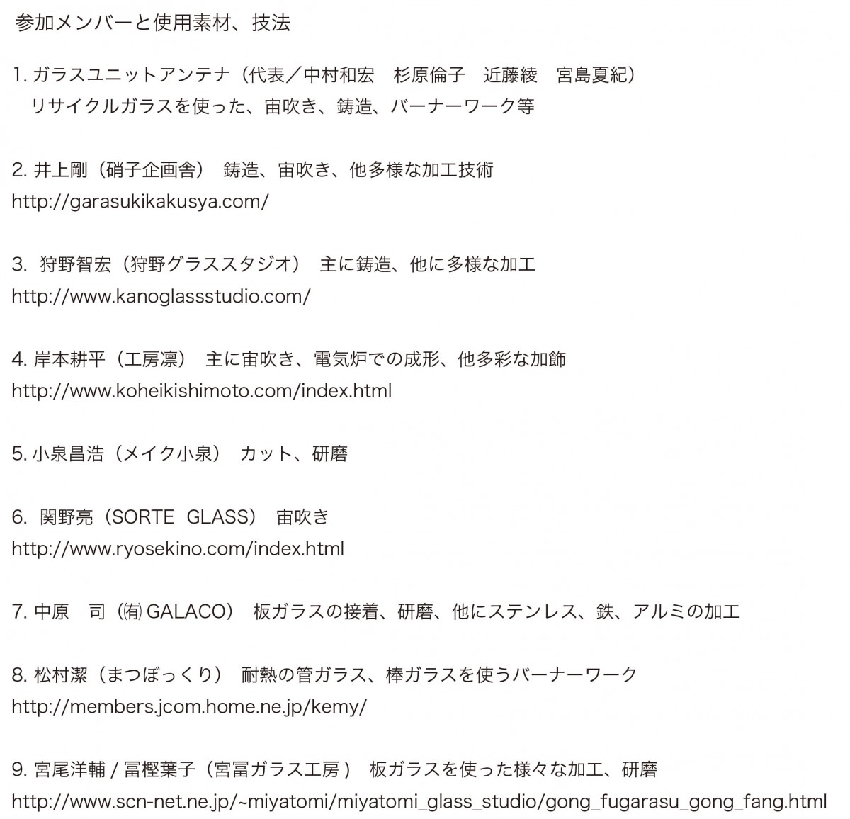 9人の作家と9人のデザイナーがチームをつくります。つまり9チームでの展示となります。つきましては下記にガラス作家さんより自己紹介、作品が掲載されておりますので、自分がコラボレーションしたいとおもわれる方を選んでいただきます。そして下記のスケジュールにそって製作にはいります。2個製作しまして、デザイナーと作家がひとつずつ保管します。展示はそのうちの一つを展示します。デザインフィーはありませんが、せいいっぱいの告知はさせていただきます。カメラマンによる写真、そしてひとつ作品が報酬となります。