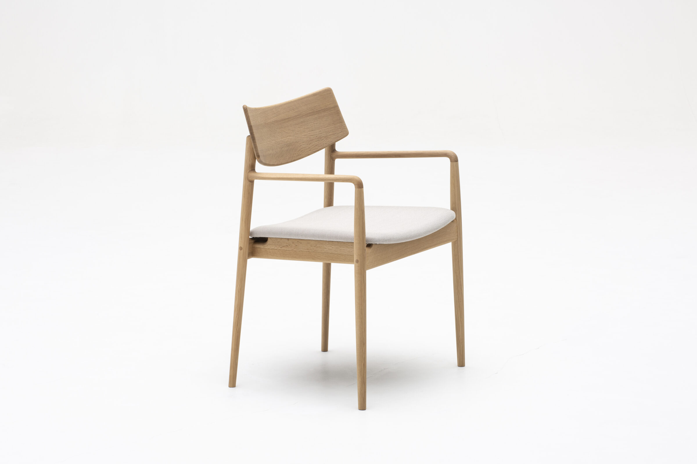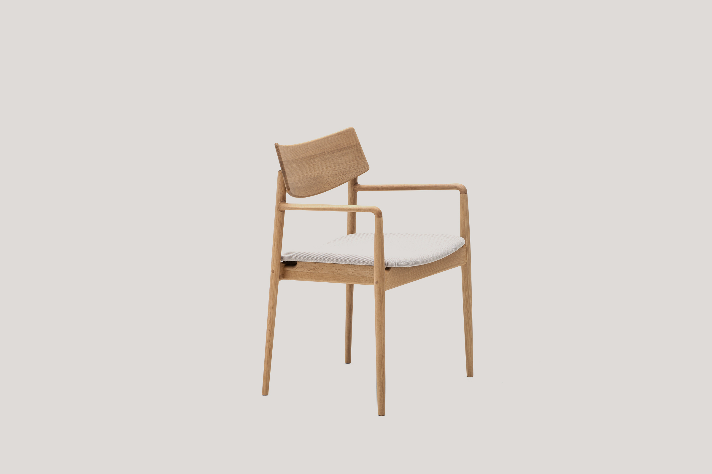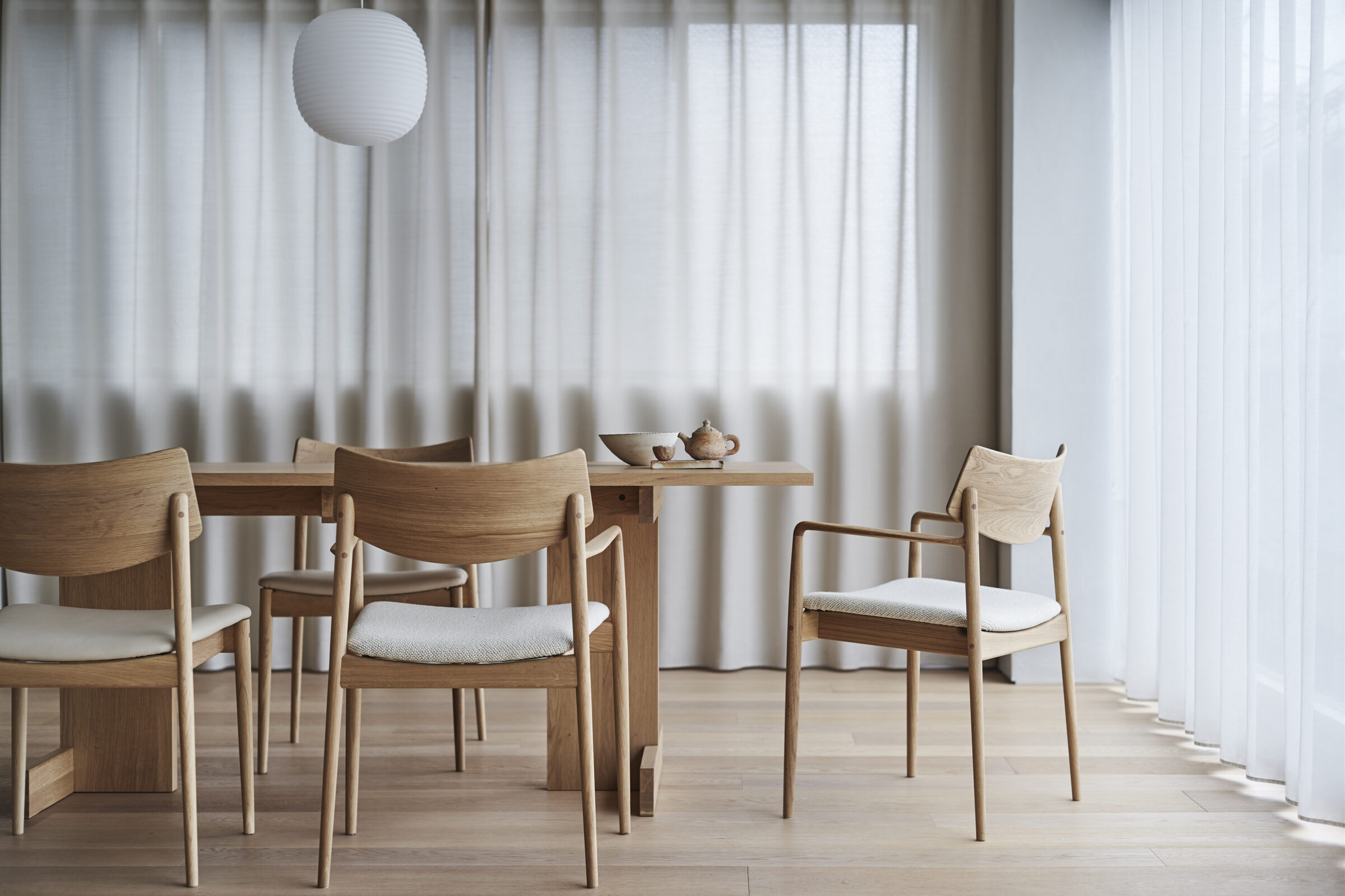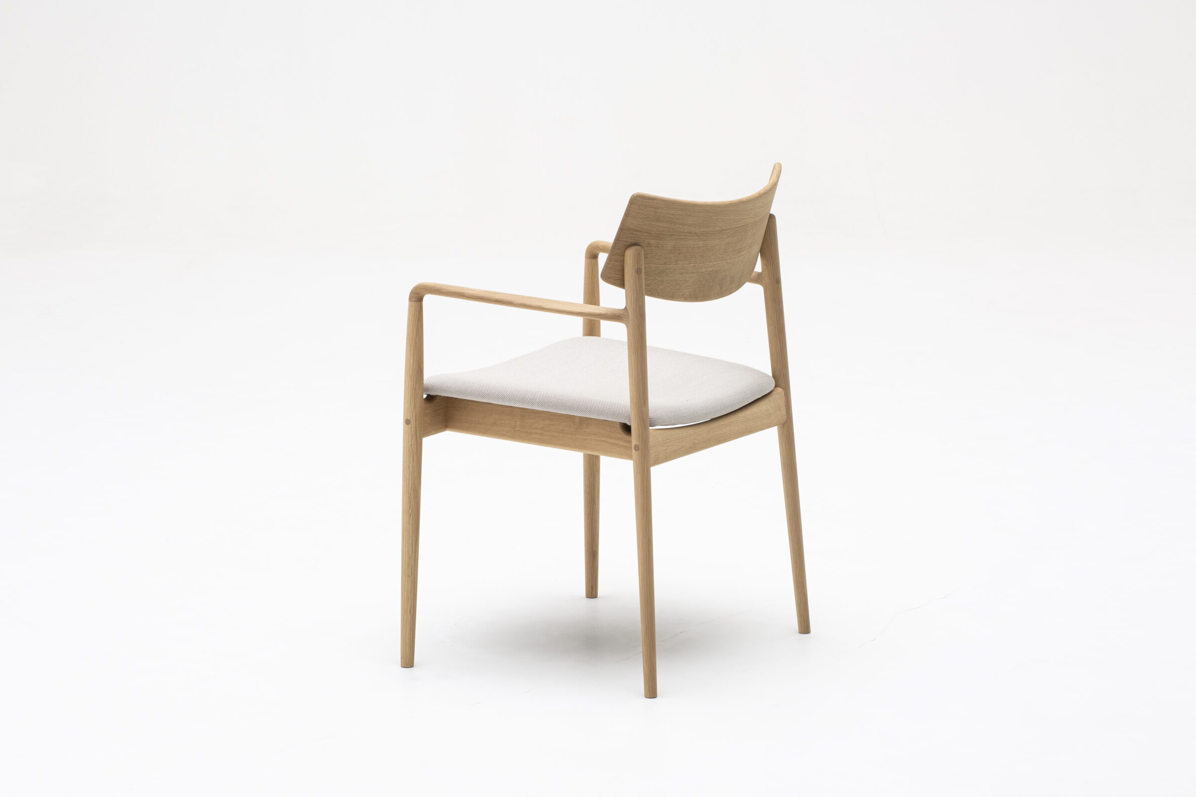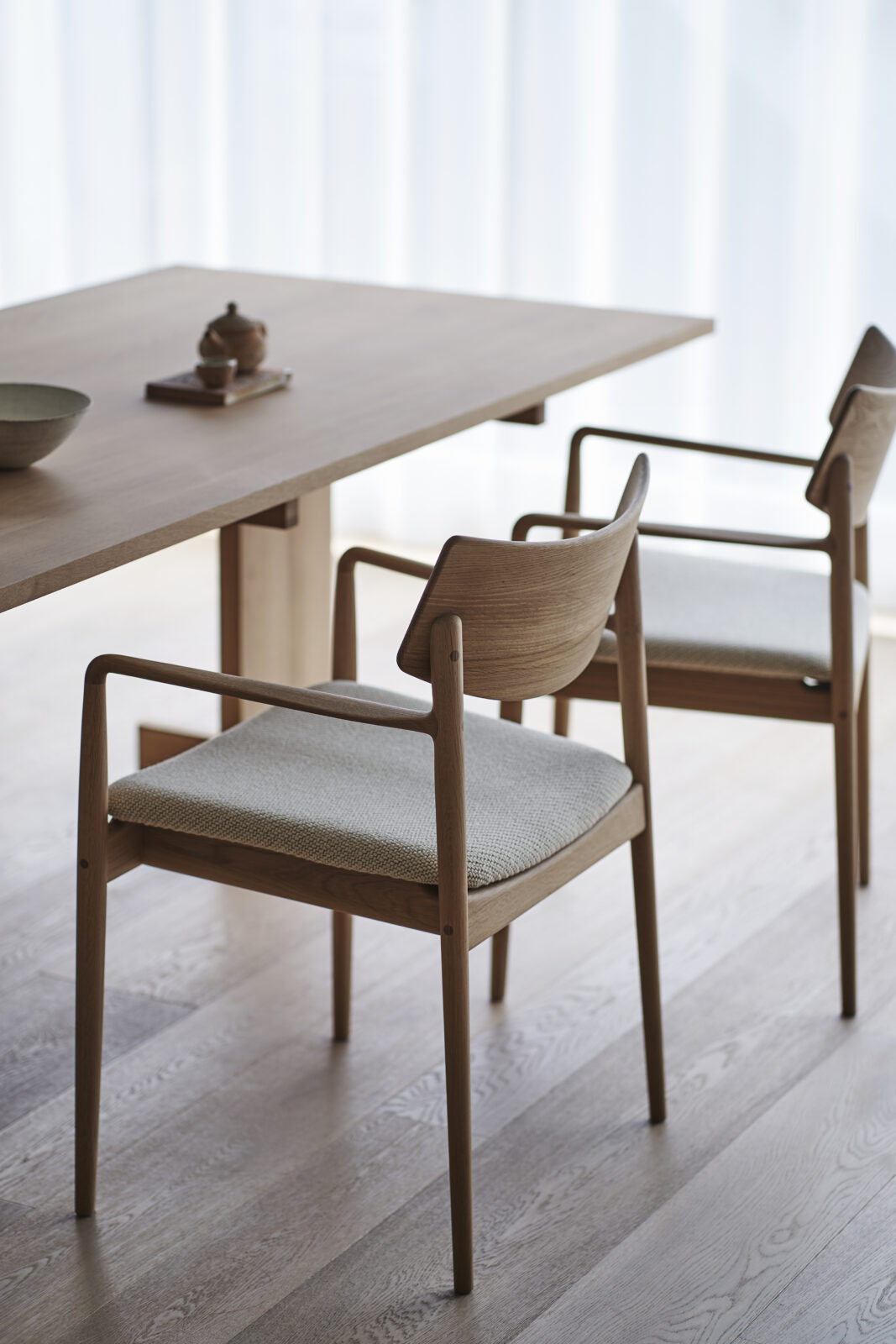 ゆったりと座って、誰かと話したり、食事を摂ったり、コーヒーを飲んだりするアクティビティをサポートしながら、豊かな素材感とカリモク家具のクラフトマンシップが、使う人の気持ちをより前向きにしてくれることを願ってデザインしました。座面に張り込まれた柔らかさのあるマテリアルに呼応するかのような無垢材を削り出した背面が柔らかい印象を与えます。