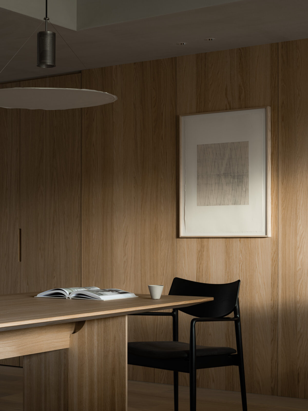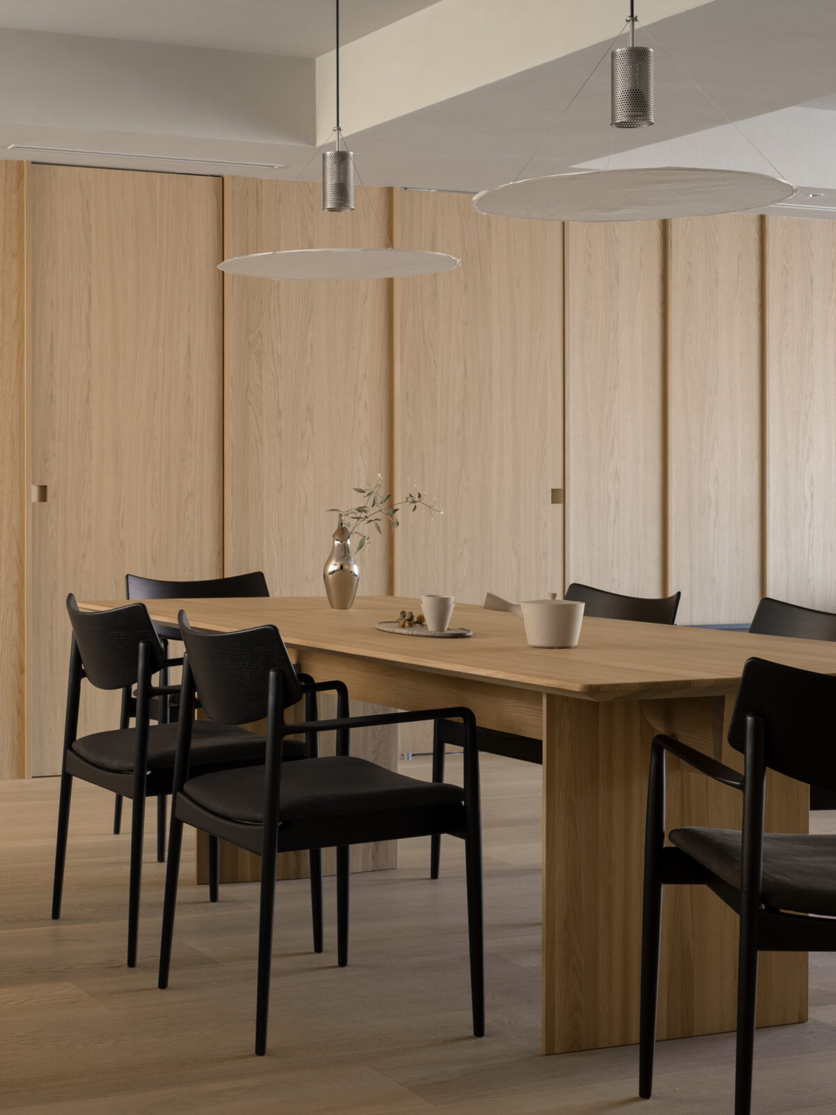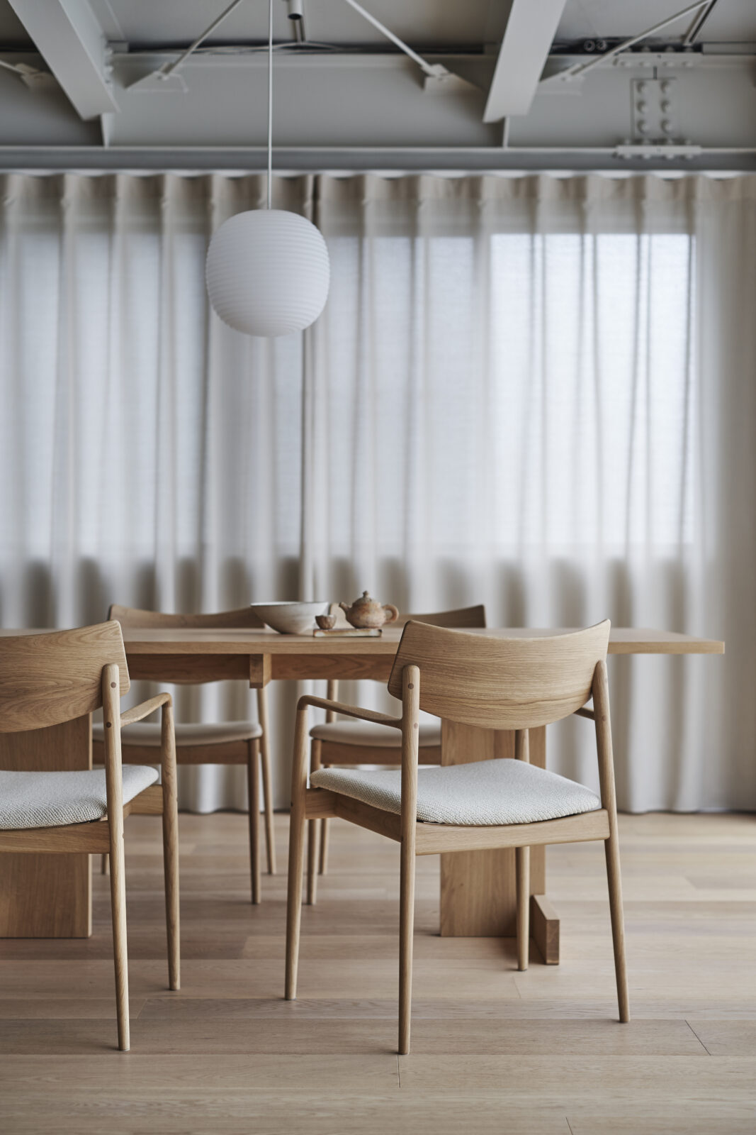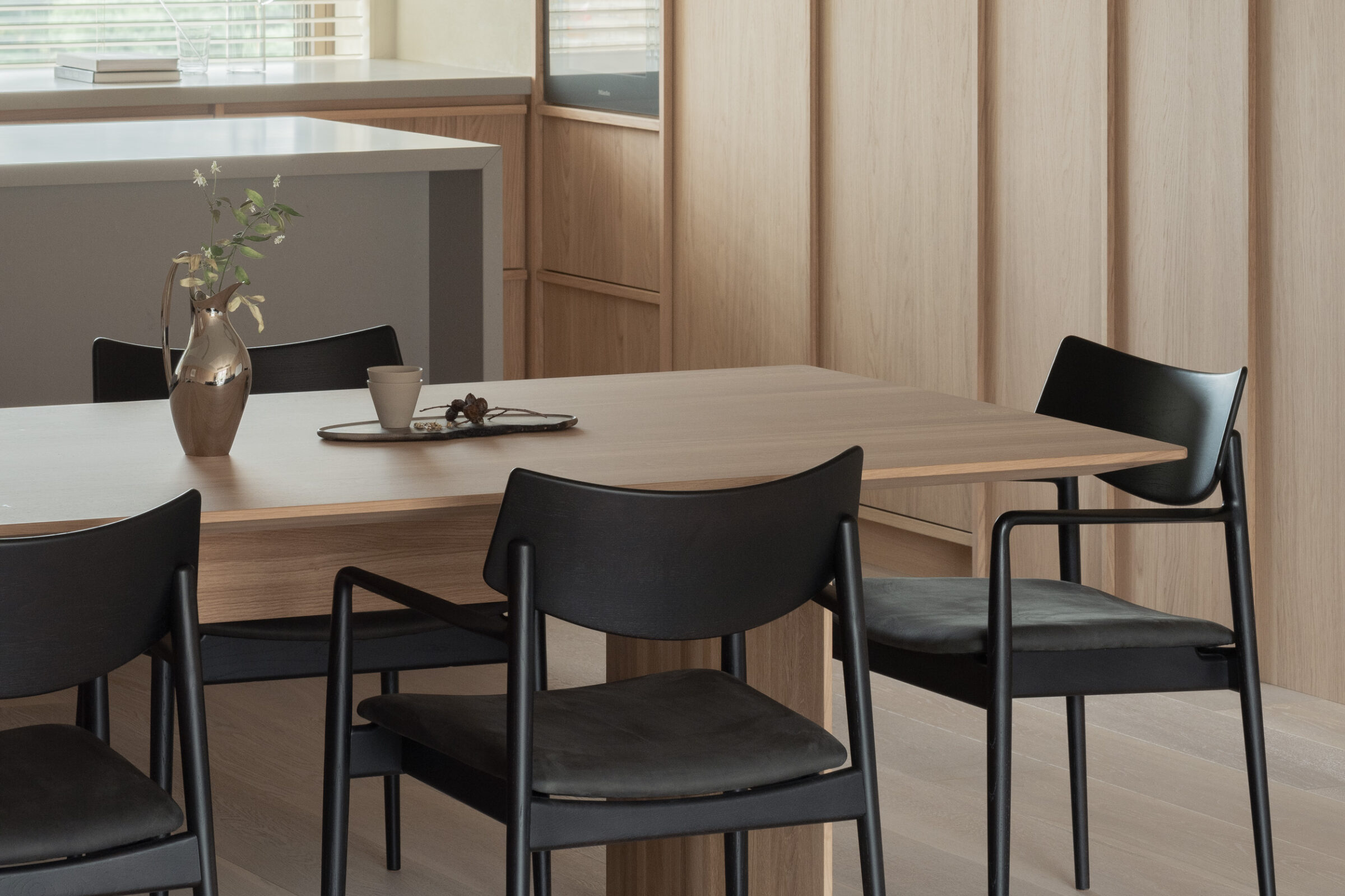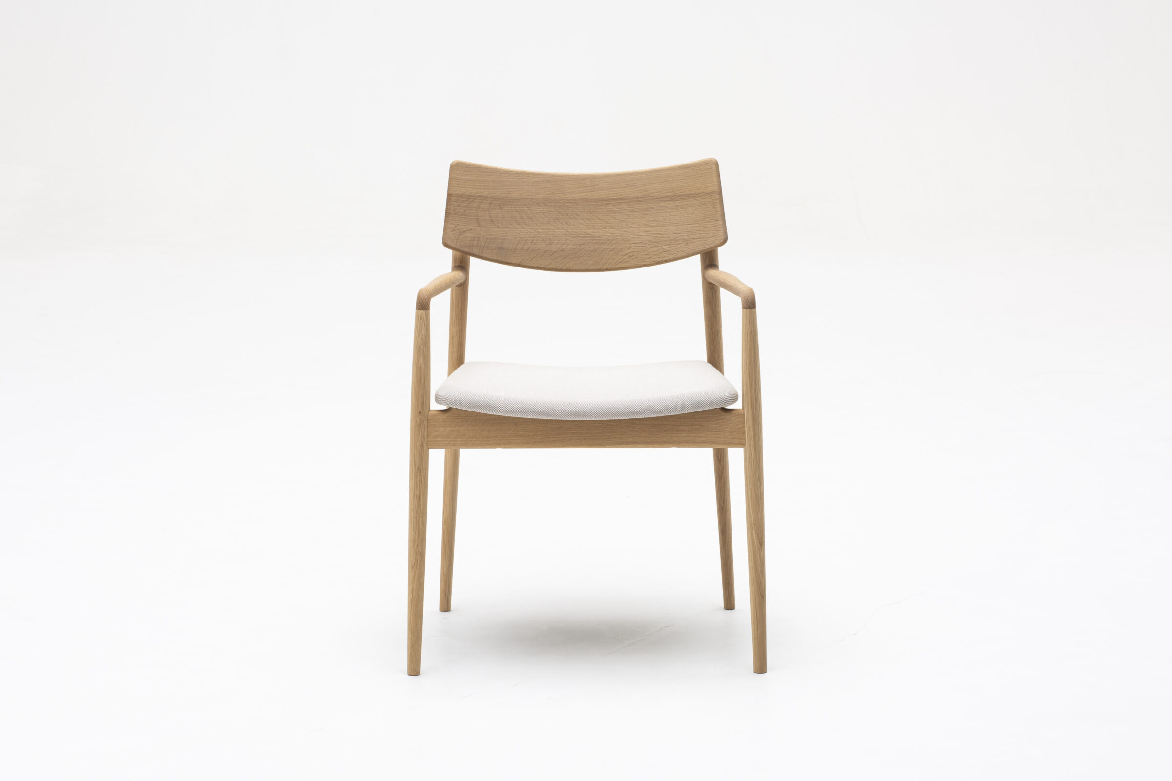 ゆったりと座って、誰かと話したり、食事を摂ったり、コーヒーを飲んだりするアクティビティをサポートしながら、豊かな素材感とカリモク家具のクラフトマンシップが、使う人の気持ちをより前向きにしてくれることを願ってデザインしました。座面に張り込まれた柔らかさのあるマテリアルに呼応するかのような無垢材を削り出した背面が柔らかい印象を与えます。