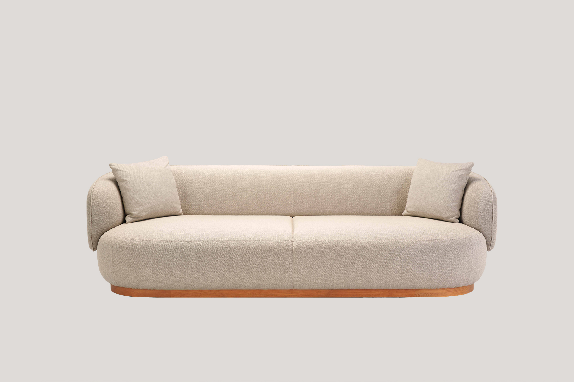 天然木を切り出した台輪がソファを支え、丸い小石に腰かけるようにゆるやかなカーブとボリュームのある質感が空間に落ち着きを与えます。1シーターはカーブに包まれリラックスした座り心地を、3シーターの大きな座面はデイベッドとしても使用できます。