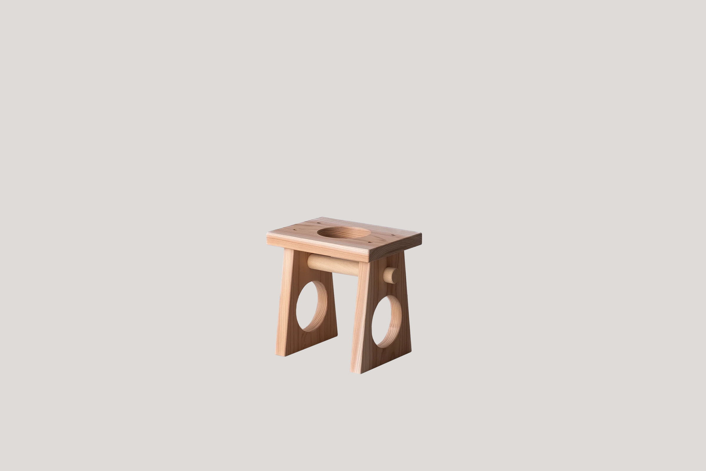 石巻工房とWosetとのコラボレーションで生まれた子供向けの軽いスツール。座面と側面を丸い円でくり抜くことにより軽量化され、子供が思い立ったときに上から丸棒のハンドルを掴み、簡単に持ち運びできます。アイコニックな丸い円は横から見るとWosetのキャラクターの顔のようにも見え、スツールでありながら愛らしい存在感を醸し出しています。